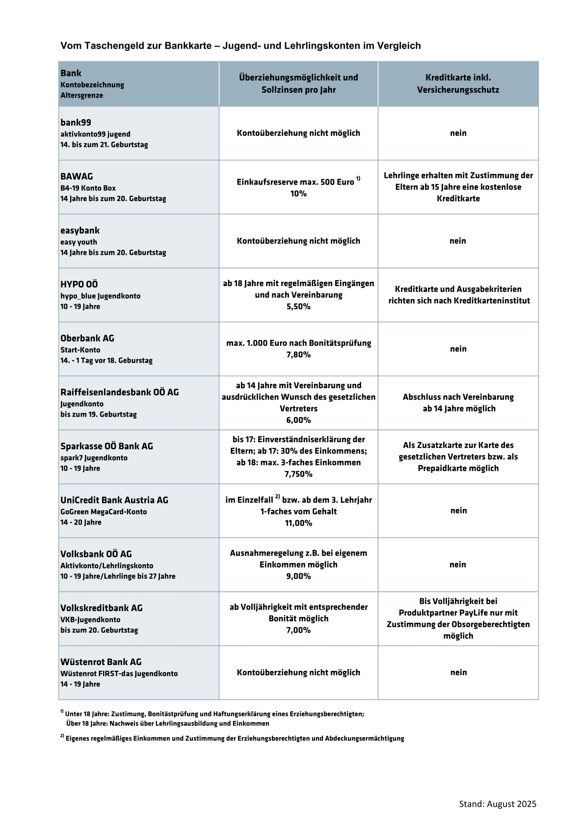Das erste eigene Konto – ein wichtiger Schritt in die Selbständigkeit. Egal ob fürs Taschengeld, die Lehrlingsentschädigung oder den Verdienst aus dem Ferialjob. Dein Konto sollte zu deinem Leben passen und dir den Alltag erleichtern. Die Arbeiterkammer Oberösterreich hat erhoben, wie sich Jugend- und Lehrlingskonten unterscheiden.